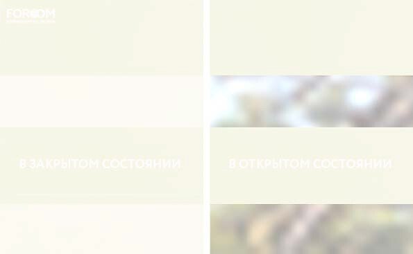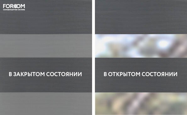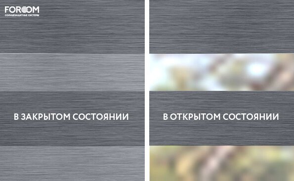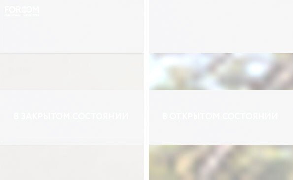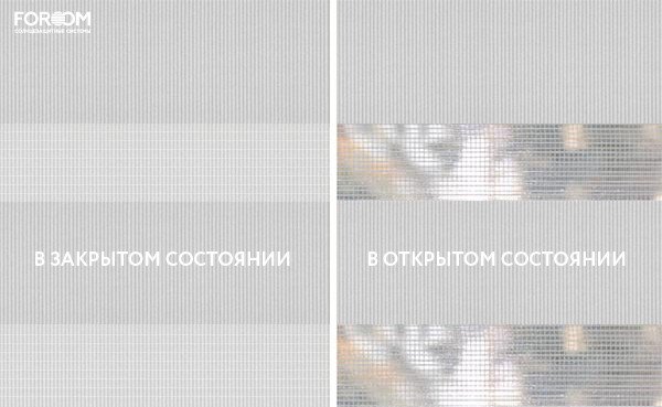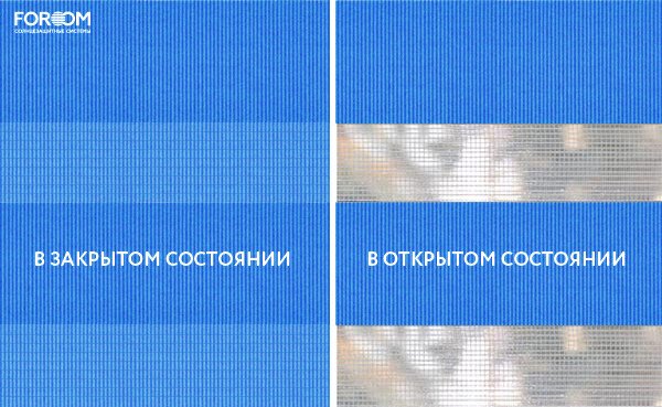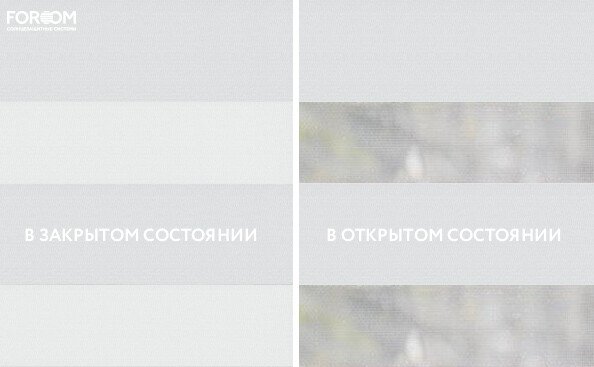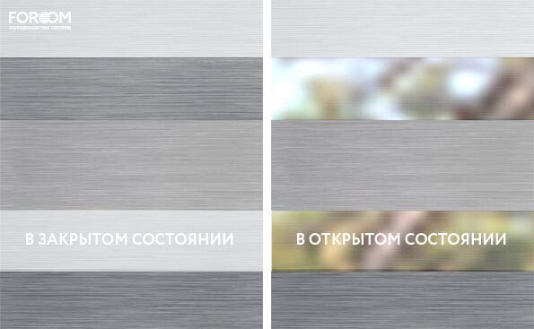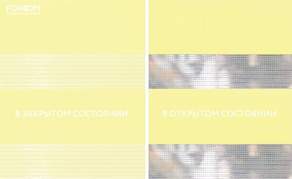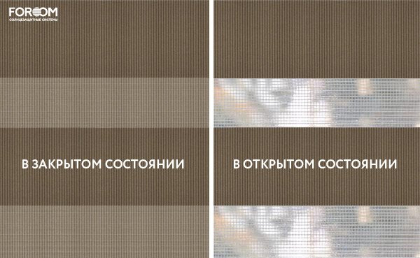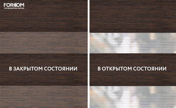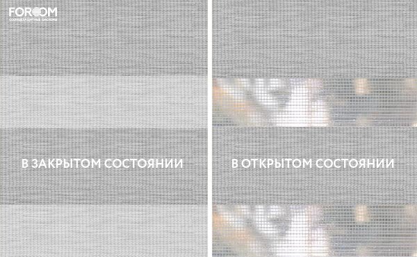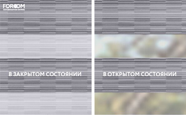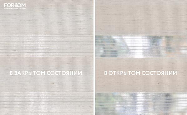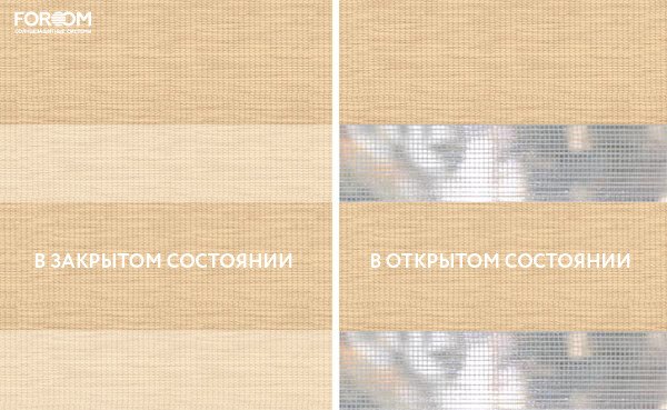 Полотно ткани, состоит из чередующихся горизонтальных полос – прозрачных и непрозрачных. Изменяя положение этих полос относительно друг другу, можно создать целых 3 режима регулировки светом. Например, чтобы в помещении стало светлее, нужно расположить прозрачные полосы друг напротив друга. Если разместить прозрачную и непрозрачную полосу параллельно друг другу, то можно добиться практически полного затемнения.